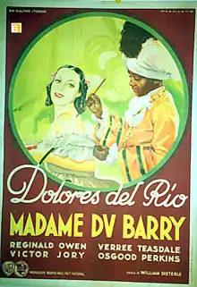 Madame DuBarry is a 1934 American historical film directed by William Dieterle and starring Dolores del Río, Reginald Owen, Victor Jory and Osgood Perkins. The film portrays the life of Madame Du Barry, the last mistress of King Louis XV of France.[1] While this film does not serve accuracy to Madame Du Barry, it does feature antiques and jewelry that came from the actual days when Madame Du Barry lived. This film was being edited just as the Hollywood Production Code was gaining real power, and faced many problems with censors of the time. A May 27, 1934, New York Times column, “Studio Activities on the Western Front”, focusing on the “cracking down” of censors noted that a reel and a half had already been cut from the film, including a bedroom scene.[2]