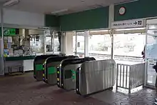 The station has a "Midori no Madoguchi" staffed ticket office. Suica farecard can be used at this station.[1]