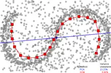 Principal curves and manifolds give the natural geometric framework for nonlinear dimensionality reduction and extend the geometric interpretation of PCA by explicitly constructing an embedded manifold, and by encoding using standard geometric projection onto the manifold. This approach was originally proposed by Trevor Hastie in his 1984 thesis,[11] which he formally introduced in 1989.[12] This idea has been explored further by many authors.[13] How to define the "simplicity" of the manifold is problem-dependent, however, it is commonly measured by the intrinsic dimensionality and/or the smoothness of the manifold. Usually, the principal manifold is defined as a solution to an optimization problem. The objective function includes a quality of data approximation and some penalty terms for the bending of the manifold. The popular initial approximations are generated by linear PCA and Kohonen's SOM.