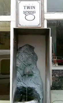Located on Ruxton Avenue, Twin Spring combines waters from two different depths and flow from one font. The spring was once called Twin Lithia Springs, as Lithium is present in the spring water at a concentration of .233 mg/L.[21] The water, high in magnesium, is considered a "sweet" water, used by locals to make lemonade. Aside from the pleasing taste, it is also sought for its potassium and calcium content. The spring was drilled by William S. Crosby in the 1920s.[6][17][18]