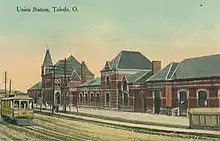 A union terminal, built in 1886 in the Gothic style, served several of the major rail lines passing through Toledo. Tenant railroads included the Baltimore and Ohio Railroad (B&O), the New York Central Railroad (as well as its subsidiaries, the CCC & St.L. (Big Four Railroad) and the Michigan Central Railroad), the Pere Marquette Railroad and the Wabash Railroad. The station caught fire in 1930 but remained standing. The damage was later repaired and service resumed.[2]