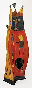 These are two sculptures made of polychrome papier-mâché on wire mesh wood. These sculptures have dimensions of Height: 245 cm - Width: 92 cm - Depth: 80 cm. These works are also made with elements such as fabric, ceramic elements of cork, raffia hair and necklaces. In its appearance you can see the use of various colors such as the use of yellow, orange, red, brown and details in blue and black. Aspects that stand out about these sculptures are their faces, presenting expressions of astonishment in the case of Guerrillero and surprise in the case of Mama Afrika. It can be perceived small elements referring to Ethiopian customs such as the use of lines, inorganic figures, colors, and details such as earrings or clothing. These sculptures were exhibited in Halle Saint Pierre, Paris 1993.[17]