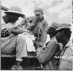African Americans were typically placed into labor battalions with around 160,000 of the 200,000 African Americans who were shipped out to France in 1917 finding themselves placed in one. These labor battalions were viewed as being the "dregs of the military forces" and the men in them were "driven to the brink of physical and emotional exhaustion".[56] Jim Crow was extended to the camps where the African American soldiers were stationed and white officers would frequently remind African American soldiers of this. The 370th Infantry Regiment were informed a black member of a labor battalion had recently been hanged in the same square the unit was now assembling in a small town outside the Lorraine region.[57]