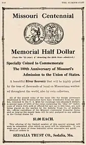 2. 1 2 3 4 "Missouri 100th Anniversary 50-Cent Piece". Retrieved April 11, 2020 via ProQuest. Click through on "66 S. 4893 – Introduced in Senate Jan. 18, 1921" for information