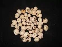 Mithila Makhana (botanical name: Euryale ferox Salisb.) is a special variety of aquatic fox nut cultivated in Mithila region of Bihar and Nepal. In Mithila, Makhana is also termed as Makhan. It is one of the three prestigious cultural identities of Mithila: Pond, Fish and Makhan "पग-पग पोखर, माछ, मखान ". It is also famous in Kojagara festival of Maithil Brahmins and Kaysath celebrated for newly married couples.[1] Makhana contains protein and fiber, along with micronutrients like calcium, magnesium, iron, and phosphorus.