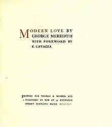 Modern Love by George Meredith is a sequence of fifty 16-line sonnets about the failure of a marriage, an episodic verse narrative that has been described as "a novella in verse".[1] Earlier working titles for the sequence were "The Love-Match" and then "The Tragedy of Modern Love".[2] It first appeared in 1862 as part of the volume Modern Love and Poems of the English Roadside, published by Chapman & Hall,[3] and then thirty years later, with slight modifications, from Macmillan.[4]