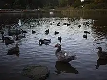 Another famous animal resident of Mountain Lake was Myrtle, a non-native whooper swan who was flightless after being pinioned.[22] Myrtle was well known in the neighborhood for disrupting traffic while crossing Lake Street and stealing snacks from the nearby Lake Market at 12th and Lake.[22] Other antics included visiting regular park patrons, watching tennis players, and attending picnics.[23] San Francisco Zoo officials believed the swan had imprinted on people sometime in the past.[23] Her last human "mate" was local resident Chuck Lantz, who lives next to Mountain Lake Park.[22] Shortly after dawn each morning Myrtle would loudly "whoop" at his back door, moving around the block and up his stairs until he responded and walked her back to the park.