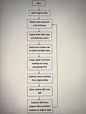 where is defined as the square region of window size, and is the window width of the smoothing filter which equals to . Therefore, the MAX and MIN filter will form a new 2-D matrix for envelope surface which will not change the original 2-D input data.[8]