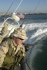 Naval Coastal Warfare Group One (NCWG 1) coastguardsman skillfully maneuvers a USCG inshore patrol boat while patrolling off the coast of Kuwait.