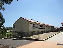 Instead, in 1954 a timber Boulton & Paul Building was constructed, comprising two classrooms (now called Block B).[69][70] Responding to materials shortages and the pressures of the baby boom, the Department of Public Works imported a British prefabricated building system from manufacturers Boulton & Paul Ltd of Norwich. Based on an 8-foot (2.4 m) planning and construction module, the prefabricated elements in the Boulton & Paul system included wall panels, ceiling panels, roof trusses and banks of awning windows. The buildings were constructed at many schools across Queensland between 1952 and 1958.[71][72] Boulton & Paul buildings were timber-framed and clad, had a verandah as circulation, and a gable roof. Ideally, they were orientated so the verandah faced north and the classroom faced south but were also added as extensions to existing buildings regardless of orientation. The building could be high or low-set and had extensive areas of timber framed awning windows, providing more glazing than had ever been used in Queensland classrooms; almost the entirety of the verandah wall and the opposite classroom wall were glazed, providing excellent natural ventilation and lighting. The classrooms were 24 by 24 feet (7.3 m × 7.3 m), larger than most previous classrooms.[73] The flexibility of the system meant that the number of classrooms constructed could vary to suit the needs of a particular school. In some cases, Boulton & Paul classrooms were used to form long, interconnected blocks, such as at Geebung State School (1951–55), Dalby State High School (1954) and Indooroopilly State High School (1953-54).[74][75][76][1]