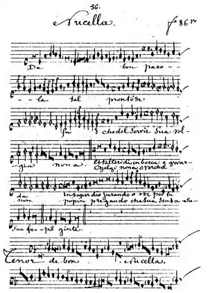 Nicolaus Ricci is known as the composer of a single, extant piece, De bon parole. It is attributed to "Nucella" on folio 86r in its single source, the manuscript Strasbourg M222 C22 (destroyed in 1870 by a fire started by a bombardment in the Franco-Prussian War[9] but surviving in a copy by Edmond de Coussemaker now in Brussels).[10] The attribution to "Nucella" was thought to be a corruption of the word "Micinella", the title of a Gloria by Antonio "Zachara" da Teramo and thus a possible work of Zachara's.[11] The new biographical evidence invalidates this theory, and some stylistic similarities can be explained by both composers being active in Rome in the Papal Chapel at the same time. This three-voice piece is in tempus imperfectum cum prolatione minori (2