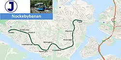 Nockebybanan is a tram line between Nockeby and Alvik in the western suburbs of Stockholm, Sweden. The 5.6 kilometers (3.5 mi) long line is part of the Storstockholms Lokaltrafik public transport network, and connects with the Stockholm metro and Tvärbanan tram at Alvik metro station. The Nockebybanan, also known as line 12, is operated by Arriva.[2][3]