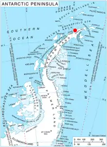 Notter Point (63°40′S 59°11′W / 63.667°S 59.183°W / -63.667; -59.183) is a rocky point 6 nautical miles (11 km) northeast of Cape Kjellman forming the north extremity of Belitsa Peninsula and marking the west limit of Bone Bay, Trinity Peninsula. The name, applied by Argentina in 1953, memorializes Tomas Notter, a commander of English origin in Admiral Brown's squadron in the struggle for Argentine independence. He died fighting against the Spanish commander Romarate on March 21, 1814 aboard his small vessel Santisima Trinidad, when his vessel grounded under enemy batteries. Beaver Rocks are a group of rocks lying 2 nautical miles (4 km) off Belitsa Peninsula at a point midway between Notter Point and Cape Kjellman.