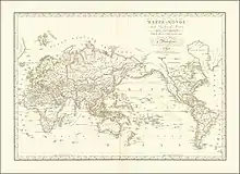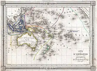 The geographer Conrad Malte-Brun coined the French expression Terres océaniques (Oceanic lands) c. 1804,[27] then in 1814 another French cartographer, Adrien-Hubert Brué, coined from this expression the shorter "Océanie" putting it on a map, "Océanie, ou cinquième partie du monde, comprenant l'archipel d'Asie, l'Australasie et la Polynésie (ou le continent de la Nouvelle Hollande et les îles du Grand Océan)".[28] Océanie derives from the Latin word oceanus, and this from the Greek word ὠκεανός (ōkeanós), "ocean". The term Oceania is used because, unlike the other continental groupings, it is the ocean that links the parts of the region together.[29] John Eperjesi's 2005 book The Imperialist Imaginary: Visions of Asia and the Pacific in American Culture says that it has "been used by Western cartographers since the mid-19th century to give order to the complexities of the Pacific area."[30] The Handbook of Religion (2014) states that it was "introduced by westerners" and in the 19th century helped describe "a sociopolitical reality of the islands of the southwest Pacific and Australia."[31]