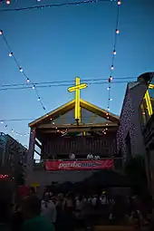 During the years of the Sydenham Assembly of God ownership, a large yellow illuminated cross was displayed on the theatre's frontage (the bracket still visible in photos post-2008). Henderson used the cross in the SOL Square development (located on the north side of the Property Ventures head office) and styled one of the bars as the Yellow Cross, prominently displaying the cross on the roof apex.[13]