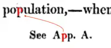 A final oddity can be observed in what appear to be "wet ink marks" visible in the scanned PDF copy of the book held at the University of Oxford's Bodleian Library. This might prove confusing to anyone unfamiliar with Victorian letterpress printing. However, it is questionable whether these are wet ink marks as, not only would the same side of the same block of eight pages be printed for the entire print run of 200 copies, according to imposition, but the same marks do not show up in other copies of the book, for example, the one at Harvard University,[17] or the two copies at the National Library of Scotland in Edinburgh. Ultimately, taking the mirror image of the page, in order to make the marks more legible, the type can be seen to match the text on the other side of each page. The marks are therefore an artefact of the scanning process, and not inherent to the book.