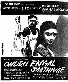 Ondru Engal Jaathiye..! (transl. One is our caste..!) is a 1987 Indian Tamil-language film co-written and directed by Ramarajan. The film stars him and Nishanthi. It was released on 31 July 1987.