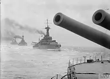 Once Jellicoe's ships had rendezvoused with the 2nd BS, coming from Cromarty, Scotland, on the morning of 31 May, he organised the main body of the Grand Fleet in parallel columns of divisions of four dreadnoughts each. The two divisions of the 2nd BS were on his left (east), the 4th BS was in the centre and the 1st BS on the right. When Jellicoe ordered the Grand Fleet to deploy to the left and form line astern in anticipation of encountering the High Seas Fleet, this naturally placed the 2nd BS at the head of the line of battle.[30] In the early stage of the battle, Conqueror and Thunderer fired at the crippled light cruiser SMS Wiesbaden with unknown results. The two ships also engaged German dreadnoughts, but failed to make any hits. Monarch and Orion, in contrast, did not fire at Wiesbaden, but shot at and hit several German dreadnoughts. Between them, the pair hit the battleships SMS König and SMS Markgraf once each, lightly damaging them, and the battlecruiser SMS Lützow five times, significantly damaging her. The sisters were not heavily engaged during the battle, with none of them firing more than 57 rounds from their main guns.[31]