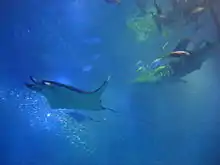 The largest tank is the Pacific Ocean tank which is 9 metres (30 ft) deep and holds 5,400 cubic metres (190,699 cu ft) of water and a variety of fish including Indian mackerel, Pacific bluefin tuna, reef manta rays, scalloped hammerhead sharks and two whale sharks.[5]