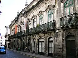 The building is flanked by a three- and two-storey building, located with a long narrow area between the Rua de Belomonte and Rua do Comércio do Porto., near the Palace of São João Novo.[1] The long symmetrical, rectangular Baroque manorhouse is marked by a two-storey frontispiece and Mansard roof, with undulating cornices and sculpted granite stone.[1]