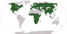 The tits are a widespread family of birds, occurring over most of Europe, Asia, North America, and Africa. The genus Poecile occurs from Europe through Asia into North America, as far south as southern Mexico. American species in this genus are known as chickadees. Some species in this genus have quite large natural distributions; one, the grey-headed chickadee, is distributed from Scandinavia to Alaska and Canada. The majority of the tits in the genus Periparus are found in the southeastern portion of Asia. This includes two species endemic to the Philippines. The coal tit, also in this genus, is a much more widespread species, ranging from the British Isles and North Africa to Japan. The two crested tits of the genus Lophophanes have a disjunct distribution, with one species occurring in Europe and the other in central Asia.[5]