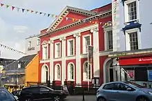 The county council generally held its meetings at the Shire Hall at 47 High Street, Haverfordwest.[7] In 1923 the council acquired the former Pembrokeshire and Haverfordwest Infirmary at the corner of St Thomas Green and Winch Lane, which had been built in 1872, converting it to become their main offices. The old infirmary became known as the County Offices, and remained the council's headquarters until its abolition in 1974. The building was subsequently used as an area office by Dyfed County Council. Following the re-establishment of Pembrokeshire County Council in 1996 and the opening of a new County Hall in 1999 the County Offices became surplus to requirements and so were demolished and a leisure centre built on the site, opening in 2009.[8]