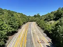 In the 1960s, plans were made to build a freeway for PA 23 between US 30 and PA 772 in Lancaster County. Construction began, but was stopped due to funding issues and public opposition. In 1977, the right-of-way for the freeway was planted over and leased to area farmers, becoming known as the "Goat Path".[29] Traces of the incomplete freeway remain, including bridges over and under local roads, grading for the roadway, and an incomplete interchange with PA 772.[2] Despite the cancellation of the freeway, plans continued for capacity improvements on the PA 23 corridor in eastern Lancaster County due to increased traffic levels.[29] Two proposed alternatives existed to build a new two-lane alignment of PA 23 east of Lancaster. The Bareville Connector Alternative would build a new two-lane PA 23 between the US 30 interchange east of the Conestoga River and Bareville, following the Goat Path and having access to Greenfield Road, Horseshoe Road, and PA 772. In addition, a two-lane Industrial Connector would be built between PA 23 in Bareville and Diller Avenue in New Holland. The Southern Alternative would build a new two-lane PA 23 between the US 30 interchange east of the Conestoga River and US 322 in Blue Ball. The route would utilize the Goat Path and have access to Greenfield Road, Horseshoe Road, PA 772, Diller Avenue, New Holland Road, Ranck Road, and Rancks Church Road.[30] The proposed two-lane bypass would have cost $100 million. In 2010, the project was shelved after the Pennsylvania Department of Transportation (PennDOT) determined it needed the money to repair structurally deficient bridges.[31]