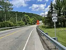 The route heads back into Deerfield Township and continues through open agricultural areas with a few homes. PA 49 turns to the northeast and enters Osceola Township, running through more rural areas. The road heads near some farms and woods before curving to the east and passing through the residential community of Osceola. The route passes through agricultural areas prior to entering the borough of Elkland and becoming West Main Street, lined with homes. PA 49 heads through the commercial downtown and becomes East Main Street, continuing through more residential areas. The road crosses into Nelson Township and crosses the Cowanesque River, becoming Barney Hill Road and passing through farmland with a few homes. The route crosses the river again and heads through a mix of woods and fields prior to another crossing of the Cowanesque River, at which point it passes to the south of Cowanesque Lake. PA 49 continues through a mix of farmland and woodland with a few homes to the south of the lake, forming the southern boundary of the Cowanesque Lake National Recreation Area and crossing into Lawrence Township. The road continues through more rural areas, turning to the northeast and coming to a diamond interchange with the US 15 freeway past the lake. The route enters the borough of Lawrenceville and passes through farmland with a few homes as Cowanesque Street. PA 49 comes to its eastern terminus at an intersection with the northern terminus of PA 287 in the commercial center of Lawrenceville a short distance south of the New York border.[1][3]