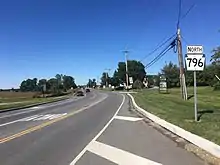 Pennsylvania Route 796 (PA 796) is a state highway in Chester County, Pennsylvania. The route runs 5.8 miles (9.3 km) from PA 896 in New London Township north to PA 41 in Londonderry Township. PA 796 heads through rural areas with some development along its route. In Jennersville, the route crosses Baltimore Pike and has an interchange with the U.S. Route 1 (US 1) freeway. PA 796 crosses PA 926 a short distance south of its northern terminus. PA 796 was originally designated by 1930 between the Maryland border near Kemblesville and north of Jennersville. In 1937, the southern terminus was moved to its current location, with PA 896 replacing the route south to the Maryland border, while the northern end was extended to PA 926 by 1940. PA 796 was extended north to PA 41 in the 1940s.