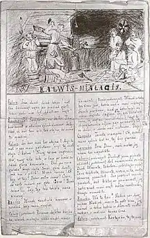 While a student in Saint Petersburg, Vileišis was a member of an informal group of Lithuanian students that used to gather in the apartments of graf Vladimir Zubov.[33] Vileišis and the group established the Lithuanian-language newsletter Kalvis melagis (Smith the Liar) in violation of the Lithuanian press ban. It was a primitive 4-page publication – handwritten and then mimeographed in secret.[34] While only about ten issues appeared between December 1875 and March 1876, it was the first known Lithuanian periodical published in the Russian Empire.[35]