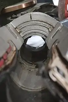 The experiments led to a particularly promising arrangement - a 40-gallon steel drum[lower-alpha 7] buried in an earthen bank with just the round front end exposed. At the back of the drum was an explosive which, when triggered, ruptured the drum and shot a jet of flame about 10 ft (3.0 m) wide and 30 yd (27 m) long.[37] The design was reminiscent of a weapon dating from late medieval times called a fougasse - a hollow in which was placed a barrel of gunpowder covered by rocks, the explosives to be detonated by a fuse at an opportune moment. Livens' new weapon was duly dubbed the flame fougasse.[36] The flame fougasse was demonstrated to Clement Attlee (Lord Privy Seal), Maurice Hankey, and General Liardet (GOC 56th Division) on 20 July 1940.[36][38]