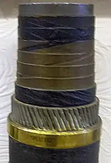The Harvey flamethrower was introduced in August 1940, and was mostly made from readily available parts such as wheels from agricultural equipment manufacturers and commercially available compressed air cylinders.[95] It comprised a welded-steel cylinder containing 22 gallons (100 L) of creosote and a standard bottle of compressed nitrogen at 1,800 pounds per square inch (120 bar) mounted on a sack truck of the type that a railway-station porter might use. About 25 ft (7.6 m) of armoured hose provided the connection to a four-foot-long (1.2 m) lance with a nozzle and some paraffin-soaked cotton waste that was set alight to provide a source of ignition. In operation, the pressure in the fuel container was raised to about 100 psi (6.9 bar), causing a cork in the nozzle to be ejected followed by a jet of fuel lasting about 10 seconds at a range up to 60 ft (18 m).[96] Like the Home Guard flamethrower, it was intended as an ambush weapon, but in this case the operator was able to direct the flames by moving the lance which would be pushed through a hole in otherwise bulletproof cover such as a brick wall.[97][95][98][99]