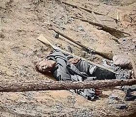 James F. Gibson (1828/29–?), perhaps the least recognized of the war's most significant photographers was also one of the least known.[25] In 1860, Scotsman Gibson's name appeared with that of his wife Elizabeth in the Washington, D.C., census, and the city directory showed that Mathew Brady employed him. Gibson may have emigrated to America with Alexander Gardner, who was also from Scotland. Gibson's first documented trip into the field was when he accompanied George N. Barnard to the Bull Run battlefield in March 1862. He worked with Gardner at Gettysburg and partnered with him at Sharpsburg, but Gibson's own greatest legacy was the wide array of photographs he took while on the Virginia peninsula,[26] in particular his poignant, landmark photo of the wounded at Savage Station, Virginia. Several years after the war, before a court could rule on Gibson's 1868 civil suit against business partner, Mathew Brady (Gibson also sued Gardner[27]), he heavily mortgaged Brady's failing Washington Gallery, which he partly owned (50%) and managed from Sept. 1864, left for Kansas with the cash, and was never heard from again.[28]