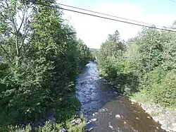 • 3.8 kilometres (2.4 mi) towards the northeast, collecting water from the Tomiche stream (coming from the north), to a country road, which it cuts at 2.7 kilometres (1.7 mi) south of the village of Saint-Benoît-Labre;