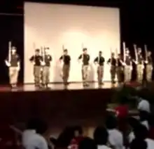 Precision Drill Squad (PDS) is a form of exhibition drill practised in Singapore which involves the execution of rifle drills in complex series of movements with great co-ordination and precision. The natures of these drills exhibit a plethora of diversity; they may be sharp and quick, graceful and flowing, or include a wide variety of tossing and spinning techniques. During performances, performers move in unison through choreographed patterns with the rifles moving under their control, always synchronised with the rhythm of the music. Drills are executed without command and the only sound that is heard is the snap and pop of the rifles on every step, in perfect synchronisation and with precision.