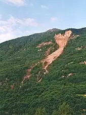 These events induced the authorities to increase the capacity of the largest retaining wall from 20,000 m3 (26,000 cu yd) to about 70,000 m3 (92,000 cu yd). The retaining wall was completed in the end of 2002. On 7–8 May 2002, about 150,000 m3 (200,000 cu yd) of rock fell over 7 hours during heavy rain from Roscioro. Only a few boulders reached the partly completed retaining wall.[11] During the night of 14–15 May 2012, there was a major rockslide above Preonzo which resulted in no deaths or damaged buildings, but did cause road closures (at intervals even the motorway). About 300,000 m3 (390,000 cu yd) of rock collapsed on 14–15 May with another 500,000 m3 (650,000 cu yd) of rock that could potentially fall in future.[12][13]