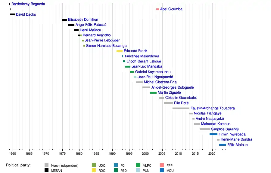 1 May 1959[6] | 13 August 1960 | 1 year, 104 days | MESAN | Seized power from Goumba, with the support of high commissioner Roger Barberot, the Bangui chamber of commerce and Boganda's widow, Michelle Jourdain.[7] | ||