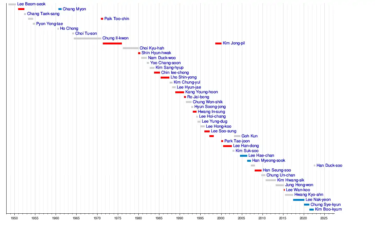 Kim Boo-kyumChung Sye-kyunLee Nak-yeonHwang Kyo-ahnLee Wan-kooJung Hong-wonKim Hwang-sikChung Un-chanHan Seung-sooHan Duck-sooHan Myeong-sookLee Hae-chanKim Suk-sooLee Han-dongPark Tae-joonGoh KunLee Soo-sungLee Hong-kooLee Yung-dugLee Hoi-changHwang In-sungHyun Soong-jongChung Won-shikRo Jai-bongKang Young-hoonLee Hyun-jaeKim Chung-yulLho Shin-yongChin Iee-chongKim Sang-hyupYoo Chang-soonNam Duck-wooShin Hyun-hwakChoi Kyu-hahKim Jong-pilChung Il-kwonChoi Tu-sonHo ChongPyon Yong-taePaik Too-chinChang Taek-sangChang MyonLee Beom-seok (prime minister)