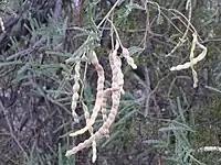 The mesquite is deciduous, losing its leaves in winter, and leafs out again in the spring when all danger of frost is past. Because of its deep root system, it keeps its leaves in the dry months of summer in all but the most severe drought years. The flowers are yellow and form in the spring (after the leaves) in dense cylindrical clusters (catkins) roughly 4 in (10 cm) long. Long seedpods (legumes) form from the flowers. They are bright green and look somewhat like pea pods when young. Mature, dry pods are hard and contain several hard, dry, brown seeds. The seeds need to be scarified before they can germinate. This scarification typically takes place in the digestive tracts of animals, which eat the seeds and then disperse them widely, as the seed takes days to pass through the animal.[4]