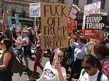 - ↑ "'Love America, Hate Trump.' Inside Today's Massive Anti-Trump Protests in London". Time. Retrieved July 15, 2018.