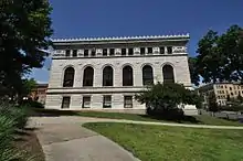 The Roman Catholic St. Michael's Cathedral adjoins the neo-classical Springfield City Library at the southeast corner of the Quadrangle.