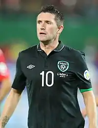Ireland took on both Portugal and the Netherlands in 2002 World Cup qualifiers in UEFA's Group 2, ending the group in second place with 24 points from 10 matches (seven victories and three draws).[11] Despite this unbeaten run, Ireland were drawn in a play-off with Iran. The match in Dublin finished in a 2–0 victory to Ireland with goals from Ian Harte (penalty) and Robbie Keane, while the match in Tehran, played in front of 100,000 spectators, finished in a 1–0 win for Iran.[11] McCarthy thus managed to lead Ireland to the 2002 World Cup final stages, though only for the team to lose inspirational captain Roy Keane due to the pair's infamous public spat in Saipan.[27] 1–1 draws with Cameroon and Germany were followed by a 3–0 victory over Saudi Arabia in Group E.[28][29][30] The Irish once again progressed to the knockout stage, only losing narrowly 3–2 on penalties to Spain in Suwon after Robbie Keane's last minute equalising penalty kick forced the game into extra time.[31]
