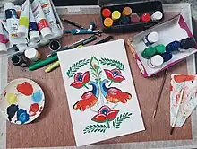 Rickshaw art covers the whole rickshaw decoration, from painted backboards and rear side panels to cut-outs appliquéd on to hoods, as well as brass vases replete with plastic or paper flowers. The painted rectangular metal board at the backside, between the two wheels, leaves a trail of passion that the Rickshaw artist puts in his creations.[3]