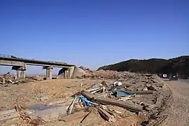 - "JR気仙沼線 【前面展望 4】 本吉⇒歌津" (video). YouTube.com. Archived from the original on 2021-12-13. Retrieved 2011-04-26. video of a train trip from Motoyoshi Station to Utatsu Station in 2009, passing through Rikuzen-Koizumi Station, Kurauchi Station, and Rikuzen-Minato Station at around 02:35, 03:55, 05:17 minutes, respectively, without stopping. Satellite photos (e.g., in Google Maps) showed that large sections of track and railway bridges were severely affected or washed away by the 2011 tsunami. Motoyoshi Station was undamaged, Rikuzen-Koizumi Station was destroyed, Kurauchi Station was damaged, and Rikuzen-Minato Station was destroyed.