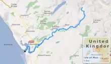 The Esk continues past the small villages of Boot and Eskdale Green. Just after Boot, the significant tributary of Whillan Beck joins the river from the north east, the beck being the outflow from Burnmoor Tarn, four km to the north. Continuing in a south westerly direction the Esk flows beneath Hinning House bridge, three km east of Ravenglass, at this point the river becomes tidal. Shortly after passing the Muncaster Castle Estate the river reaches the Irish Sea at Ravenglass. At its estuary the Esk is joined by the rivers Irt and Mite. The estuary has evolved over the centuries, the Esk and Irt were earlier separated by a shingle bank formed by the sea, dunes were formed when they eventually joined together. The estuary dunes are the location of the Eskmeals nature reserve, a Site of Special Scientific Interest (SSSI) over an area of 165.5 acres (67 hectares). The SSSI is made up of mostly coastal dunes and salt marsh attracting breeding birds and a profusion of flowers.[1] The dunes are also the site of the Eskmeals Range, a shooting range owned by the MOD) and operated by the contractor Qinetiq.[2] The estuary is crossed by the Cumbrian Coast Line railway on the Eskmeals viaduct just south of Ravenglass.[3]