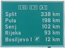 Information and direction signs (Croatian: Znakovi obavijesti za vođenje prometa) inform road users about the provision of road directions, the layout of destinations and the management of traffic towards them, intersections and junctions on a certain road direction and distances to destinations.[9][10]