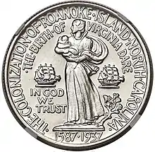 The Roanoke Island, North Carolina, half dollar (also Roanoke Island half dollar) is a commemorative coin issued by the United States Bureau of the Mint in 1937. The coin commemorated the 350th anniversary of the Roanoke Colony, depicting Sir Walter Raleigh on one side, and on the other Eleanor Dare, holding her child, Virginia Dare, the first child of English descent born in an English colony in the Americas.