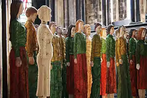 Most of us, to some extent, remember the stories we were told as children – fragments of fictional tales designed to engender good behaviour, or simply fuel our imaginations. For Robert Koenig, growing up in the suburbs of Manchester, the stories were all too real – rich tales of his mother's childhood in south-east Poland, full of community and characters, superseded as he grew older by the altogether darker narrative of her wartime removal to Germany, the hell of the labour camps and her eventual arrival in the UK. For Koenig, the stories stuck, creating a desire to learn more, to see the country of his ancestors and to come to terms with his family history. As a young man in the 1970s, he endured lengthy coach rides and the privations of communist Poland to rebuild the bond with his greater family. As his knowledge of that country grew, so did his realisation that he was shaped more deeply by his past: a sculpting contemporary of Anthony Gormley at London's prestigious Slade School of Art, Koenig suffered for his instinctive – and unfashionable – decision to work in wood, a form which he was now to appreciate as a distinctly Polish tradition. As he matured, Koenig sought his defining project and so in 1997 began carving a series of greater-than-life-size figures, initially called "Dziady", the Polish name of a ceremony celebrating the memory of deceased ancestors, but since renamed "Odyssey" for what has become an international audience. A mass of figures to represent the ancestors he never met, they are "monumental", although rather than crying out for attention, they appeal to the viewer on a more intimate, empathetic level, often inspiring strong emotions from those who come into contact with them. A film of Robert Koenig's tour to the Ukraine – Dziady: In Search of Jan Dudek – will be released soon.[10] (Jan Dudek is Robert Koenig's sculptor uncle who died in 1929 in Przemyslany, Poland – now a part of Western Ukraine).