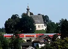 The next station is Traunstein, where several lines branch off: the line to Ruhpolding, the line to Traunreut and Garching and the line to Waging. In Traunstein the railway passes over a bridge over the Traun. The line runs over a steep downhill section towards Freilassing. Shortly after leaving Traunstein station, Ettendorf church (St. Vitus and Anna) lies next to the line. In Freilassing station a branch from Mühldorf and another branch from Berchtesgaden join the line. On the outskirts of Freilassing the line crosses the border, which runs along the Saalach river, into Austria and the outskirts of Salzburg. In Siezenheim there is a freight yard with sidings to a large chipboard factory in an industrial area and to the Schwarzenberg barracks. Then the line runs between the districts of Taxham, Maxglan and Mülln to the south and Lehen and Liefering to the north across the Salzach to Salzburg Hauptbahnhof.[9]