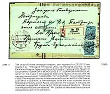 Mail from some of the post offices is scarce. There is only one known piece of mail from the Russian post office in Ulankom,[1] for instance, which was discovered by Michel Liphschutz in the 1940s.